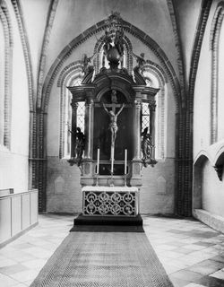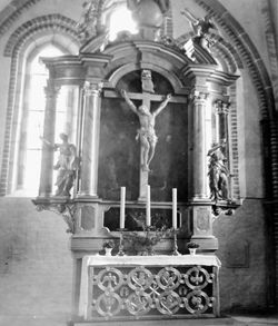 Um die architektonischen Linien hervorzuheben, ist neben der farbigen Bemalung auch der Ziegelrohbau (an den Pfeilern und Wandpfeilern, dem Triumphbogen, den Fenster Umrahmungen usw. zur Verwendung gekommen. Eine mittelalterliche, aus Holz geschnitzte und farbig bemalte Kreuzgruppe (der Gekreuzigte in der Mitte, rechts und links Maria und Johannes), 1852 in den Turmraum verwiesen, hat ihren ursprünglichen Platz unter dem Triumphbogen wieder erhalten.